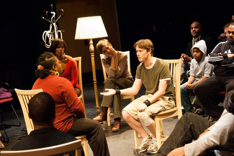 Shawanda Williams has training and extensive experience in race-based conflict mediation, as well as reliable acting instincts. Nevertheless, this climatic scene was risky every evening. The piece had a built-in way to re-enter from the audience discussion back into the dramatic progression of the show. That notwithstanding, each night brought about new iterations of how the audience could take this moment into its own hands and hearts. Williams' mediation experience proved invaluable. She invited alternative ways of thinking and conducted a discussion with the audience. Williams was the audience's volunteer, the person the audience could use to try out their own ideas for action. Moving an audience to think "is an act," McCauley says, "it is not before or after the act" (McCauley 1994, 213).